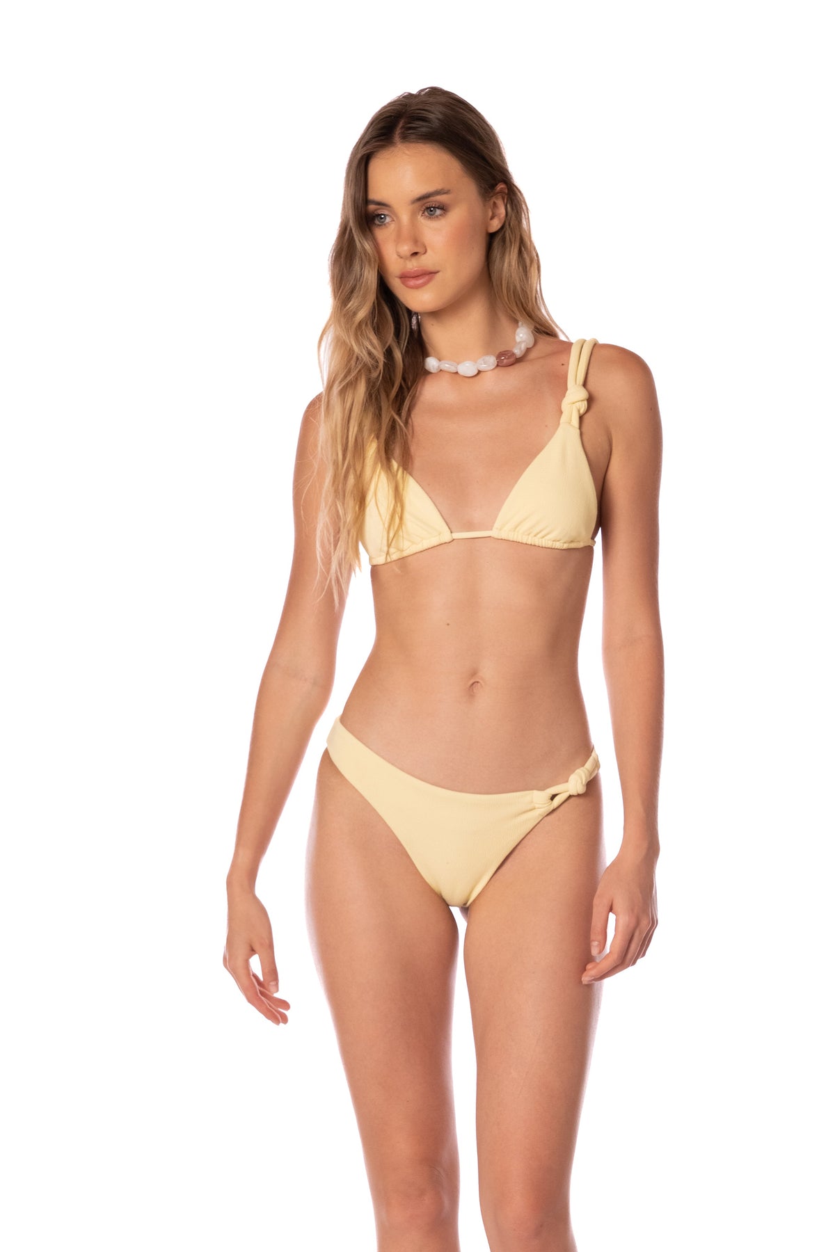 The Kibys Sun Essence Charlotte Bottom offers a flattering mid-rise fit in a rich butter yellow hue. Made from soft textured fabric, it contours beautifully while providing moderate coverage and comfort. Finished with subtle ruching knot details.