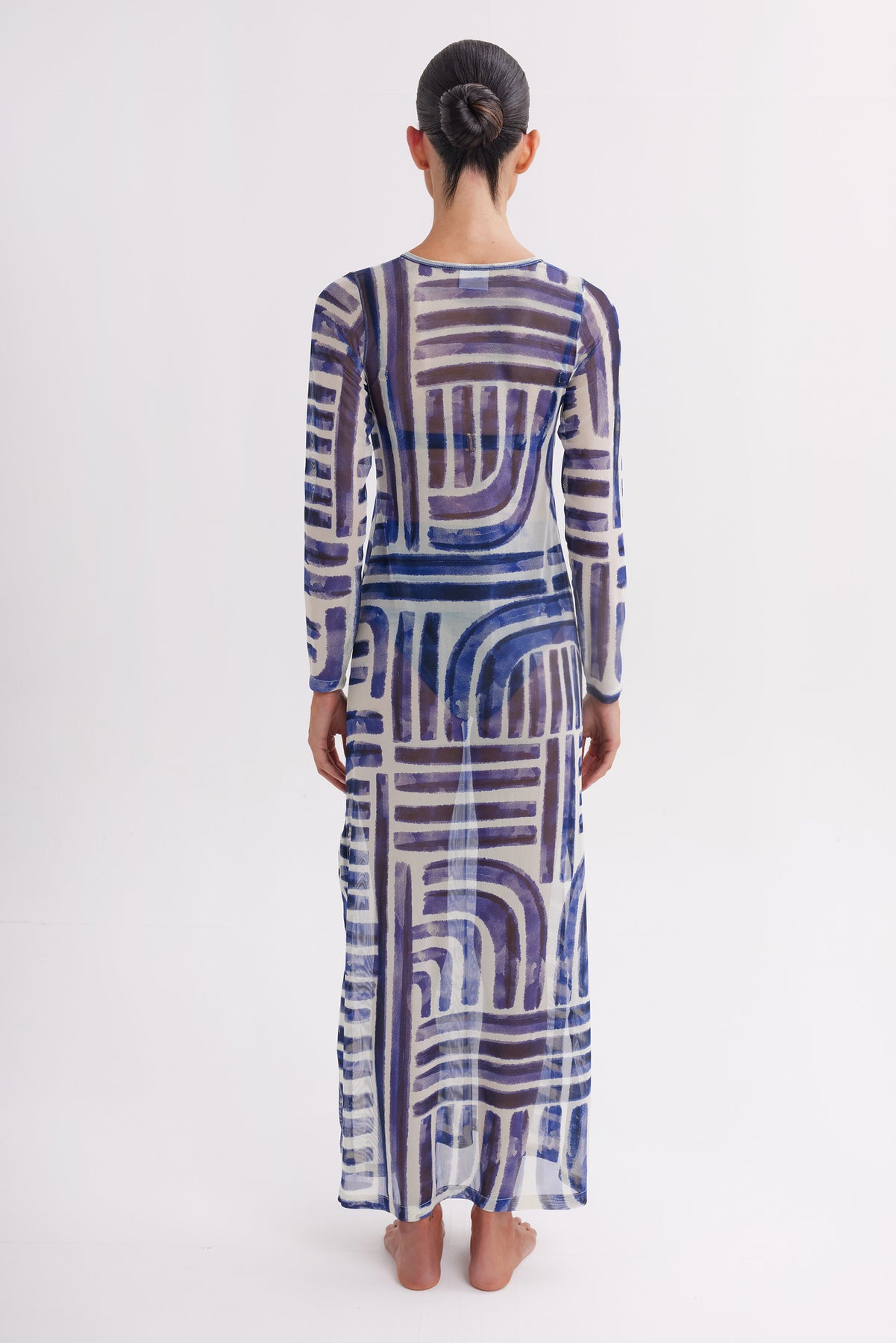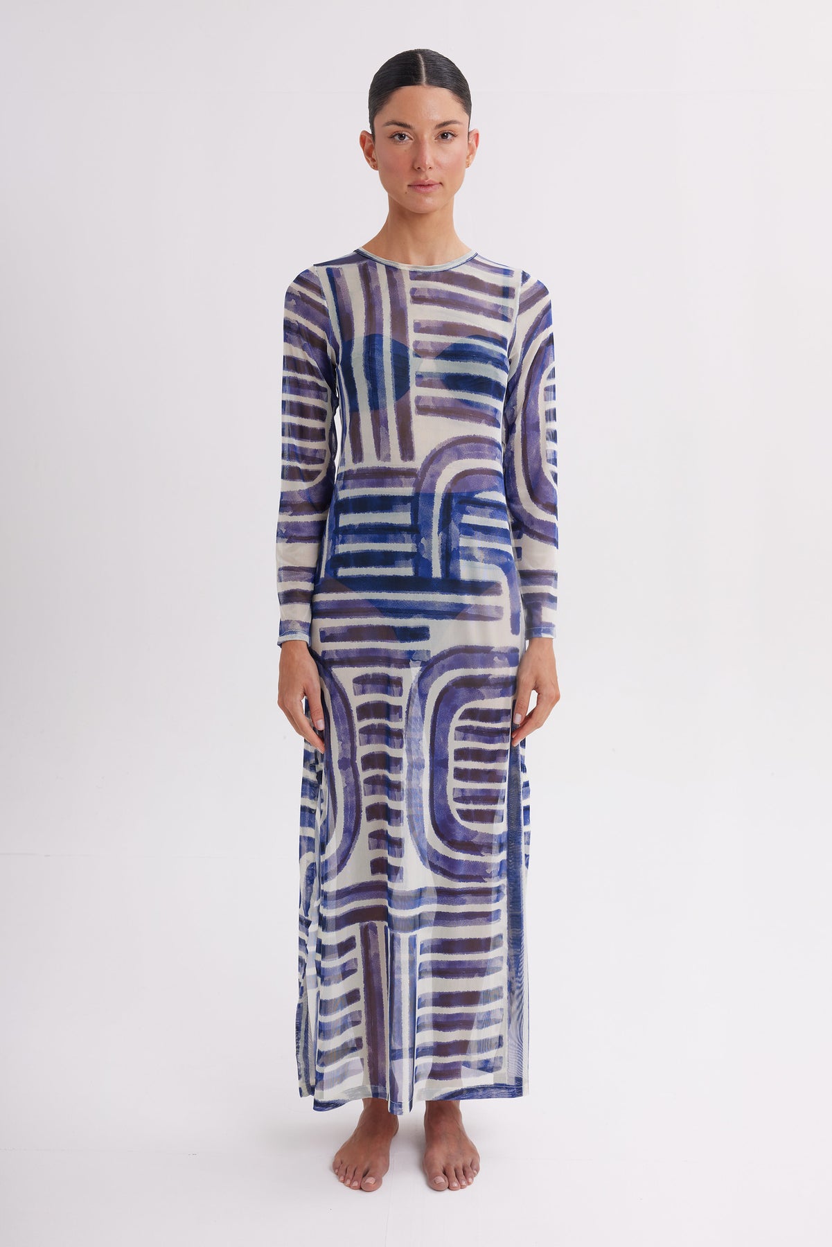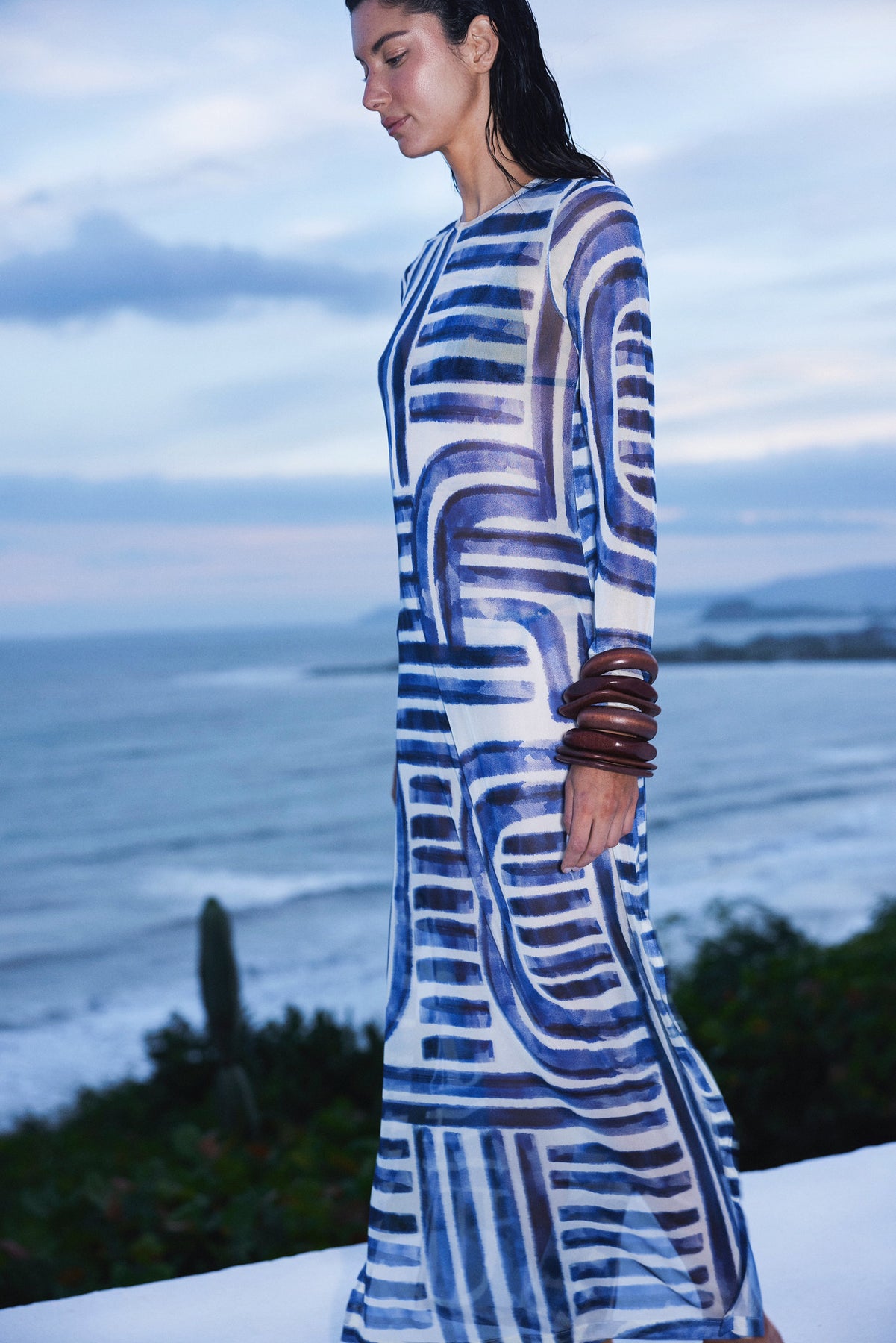 Sheer fabric · Long sleeves · Maxi length · Blue geometric print · Lightweight and breathable