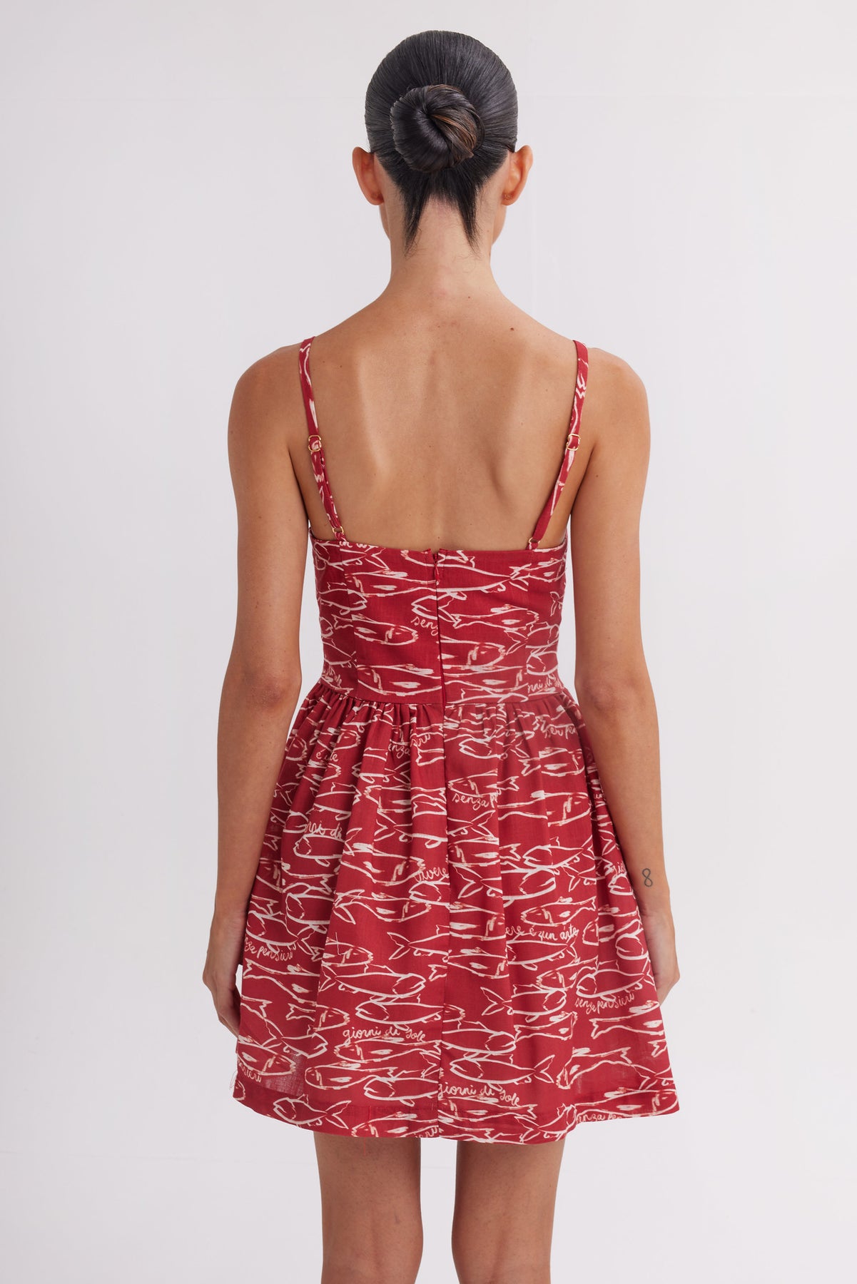 Details: Printed design · Adjustable straps · Structured bodice · Flared skirt · Mini length · Back zipper