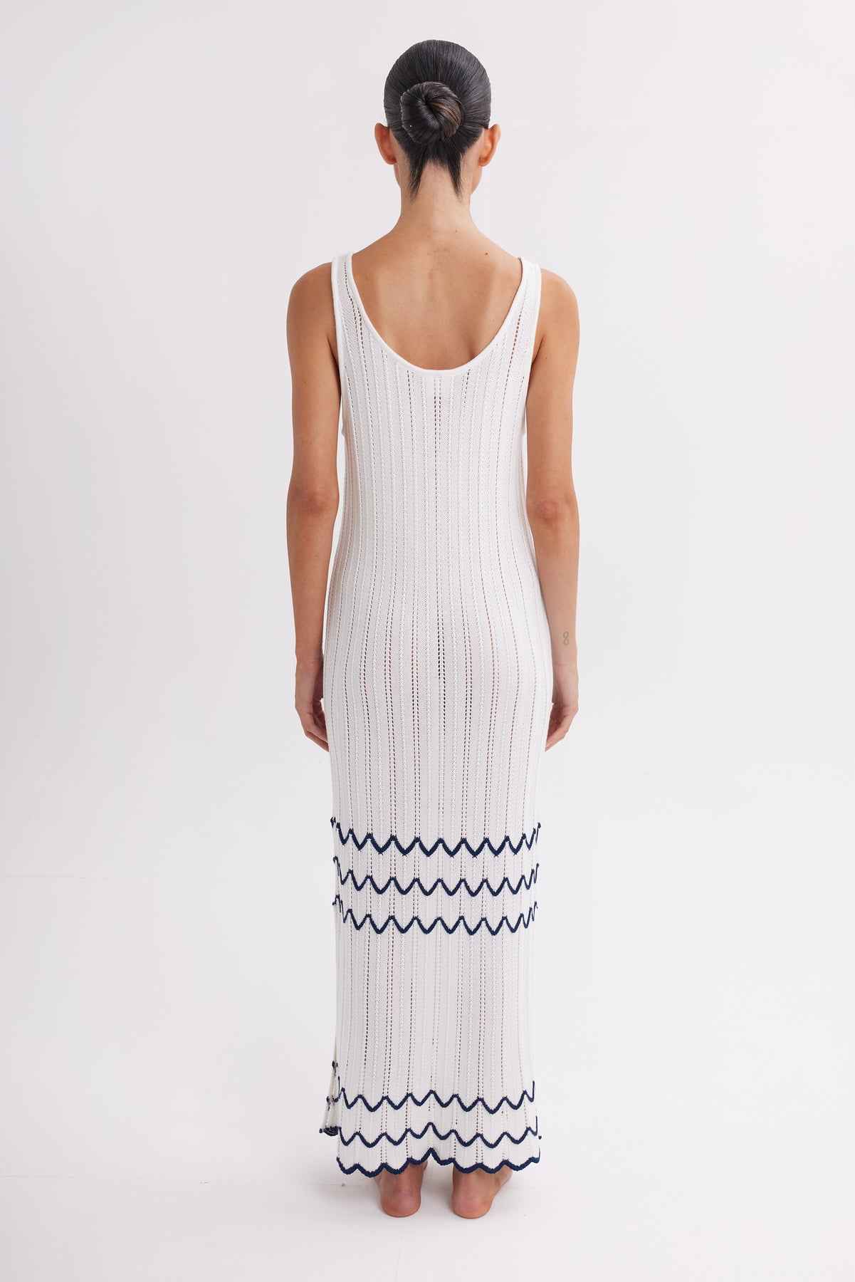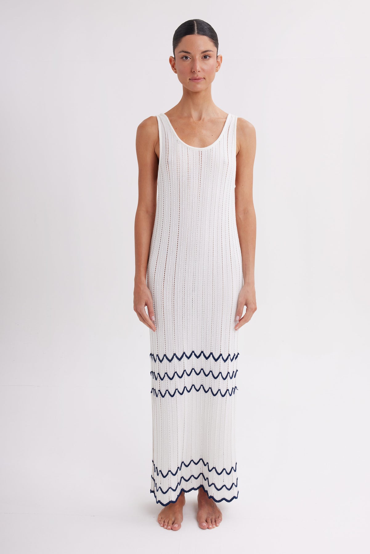 The ivory base is elevated with delicate navy wave detailing, adding a subtle coastal touch that feels both modern and timeless. Its sleeveless silhouette and elongated shape create a clean, understated look perfect for warm-weather days and effortless resort dressing.