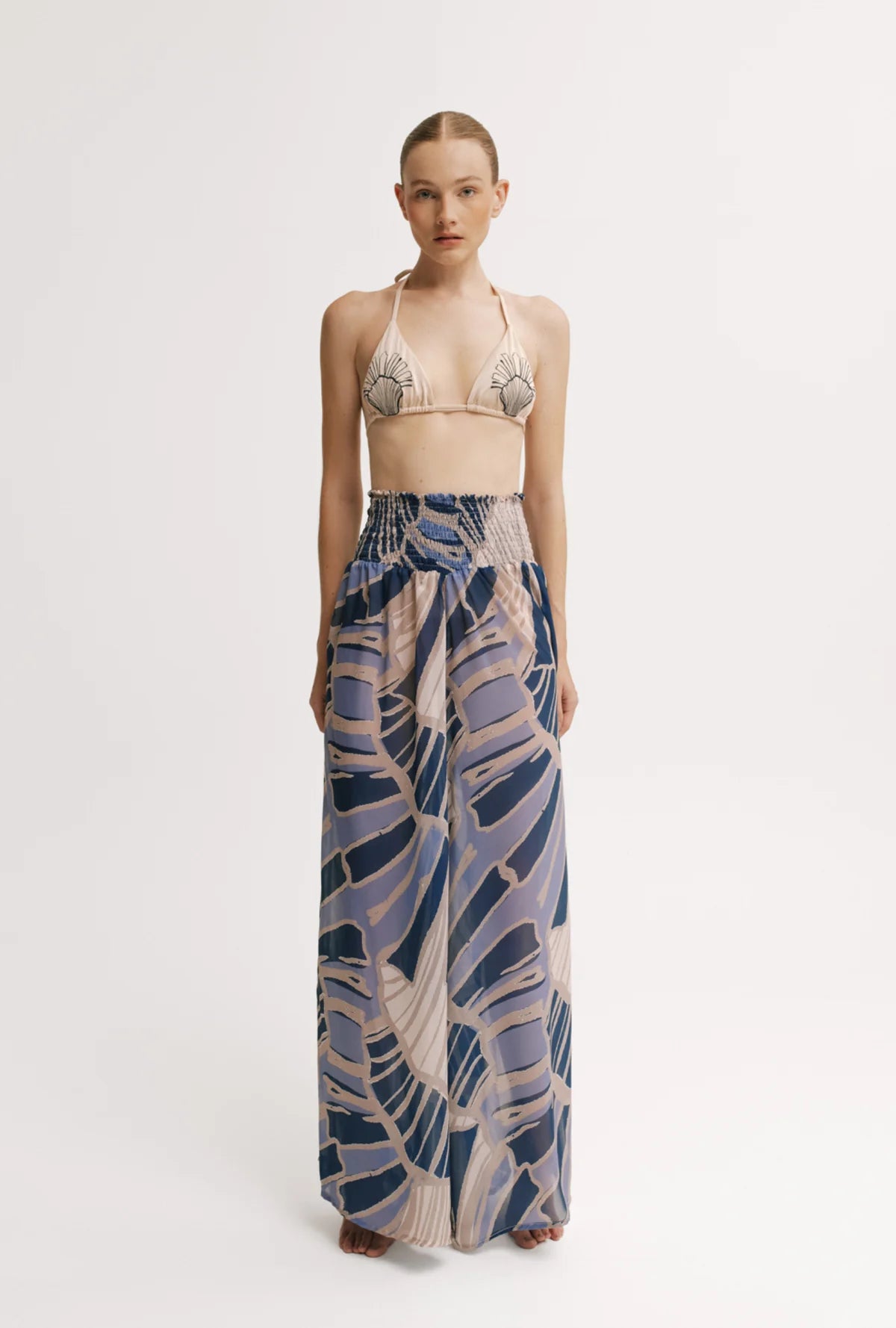 Wide-leg silhouette · Smocked elastic waistband · Soft, flowy drape · Blue shell-inspired print · Full length