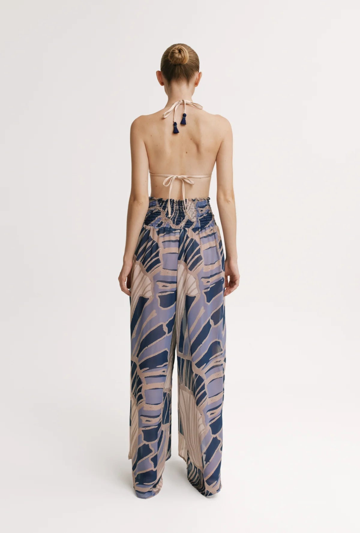 Effortless, elevated, and designed to move with you. The Kate Caracola pants feature a wide-leg silhouette and a soft smocked waistband that sits comfortably while enhancing the waist. The fluid, lightweight fabric creates a relaxed yet refined look, finished with a blue shell-inspired print for a modern coastal feel.