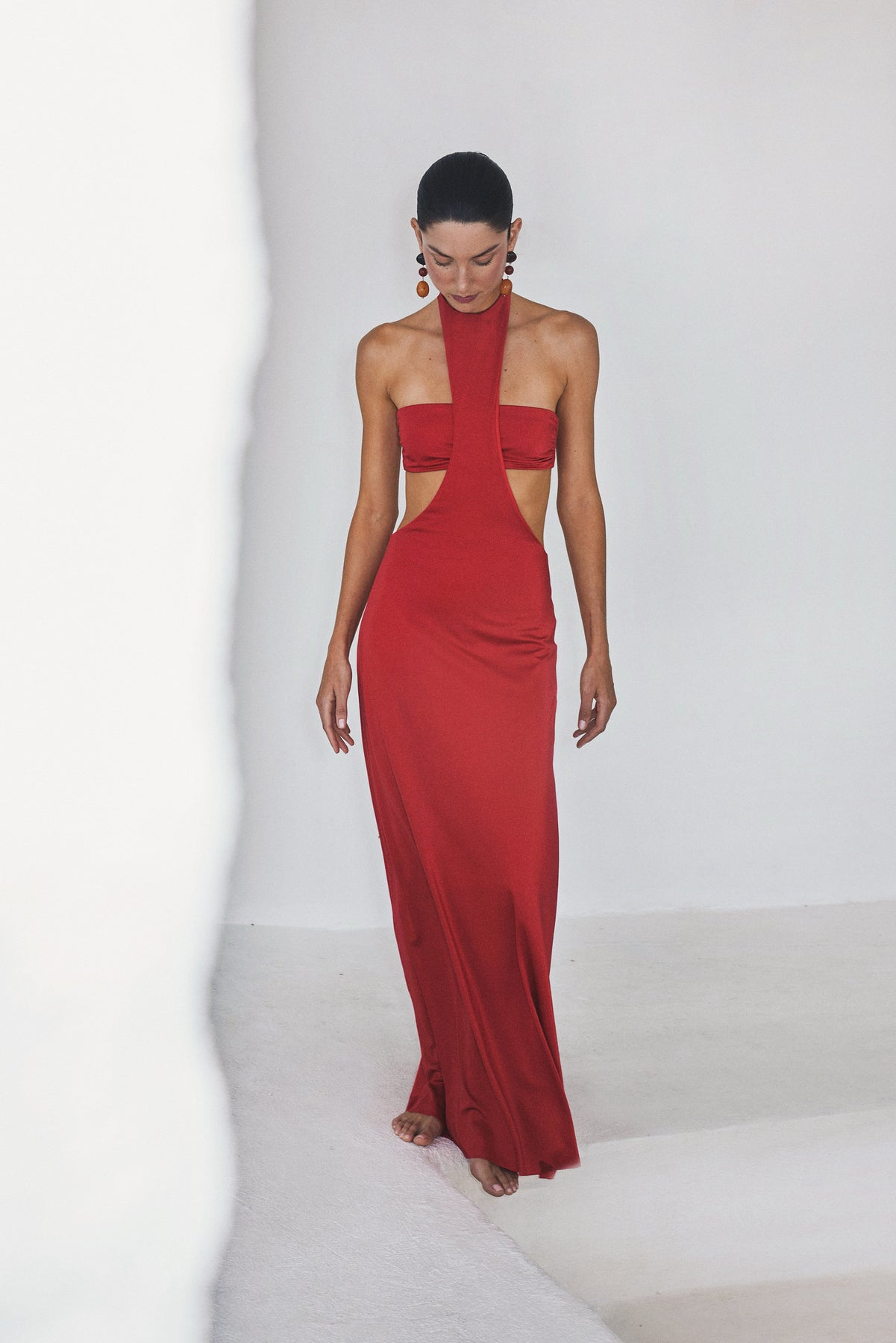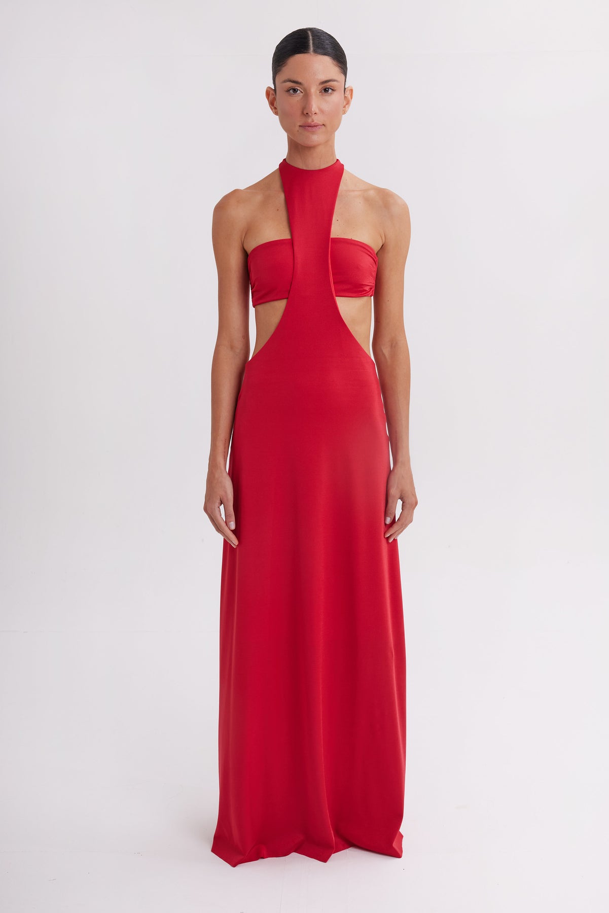 Bold and sculptural, the Marti Escarlata Dress is designed to stand out. The halter neckline frames the silhouette, while the cut-out waist creates a striking, contoured shape.Falling into a fluid maxi skirt, it moves effortlessly with every step—balancing drama with elegance.