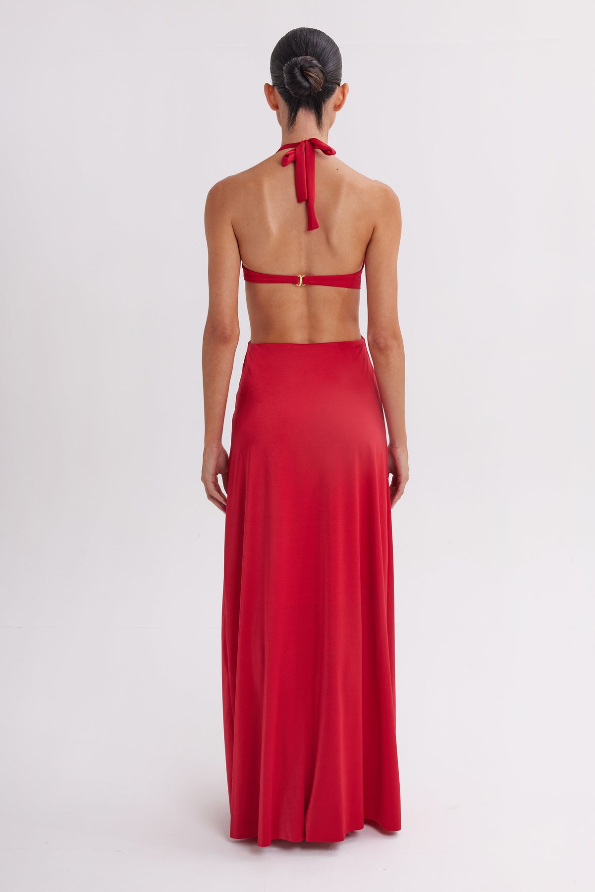 Halter neck · Cut-out waist · Open back · Flowing skirt · Vibrant red tone