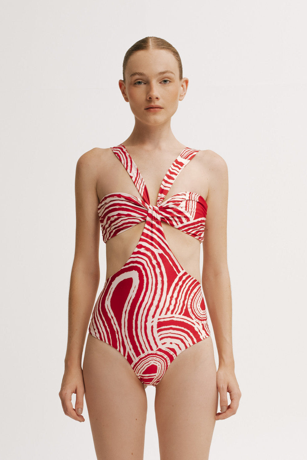 A sculptural swimwear at its finest. Designed in the signature Arena swirl print in bold red and ivory, this striking silhouette features a twisted bandeau bodice, elongated shoulder straps, and artful cut-outs that frame the waist with effortless sophistication. The high-rise bottom elongates the legs while the open back tie closure ensures a flawless, adjustable fit.